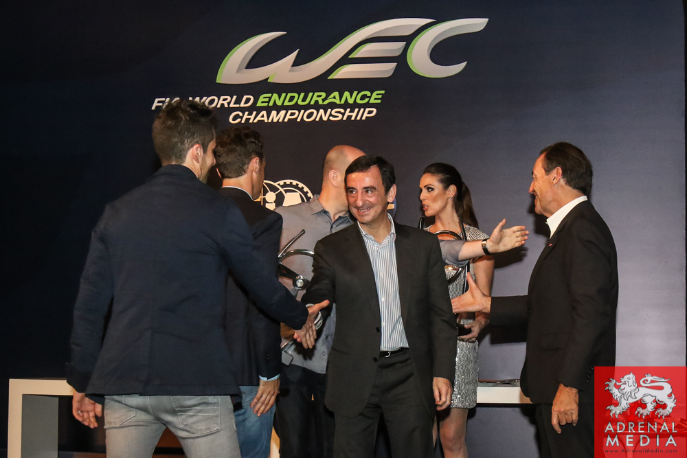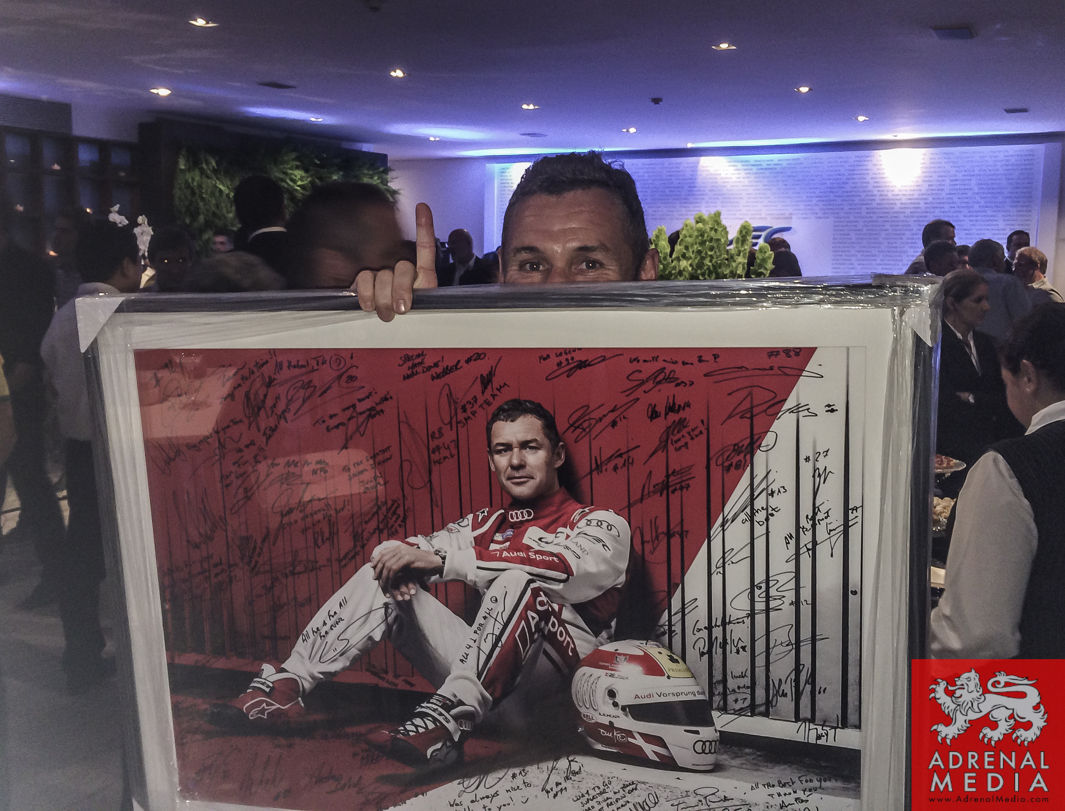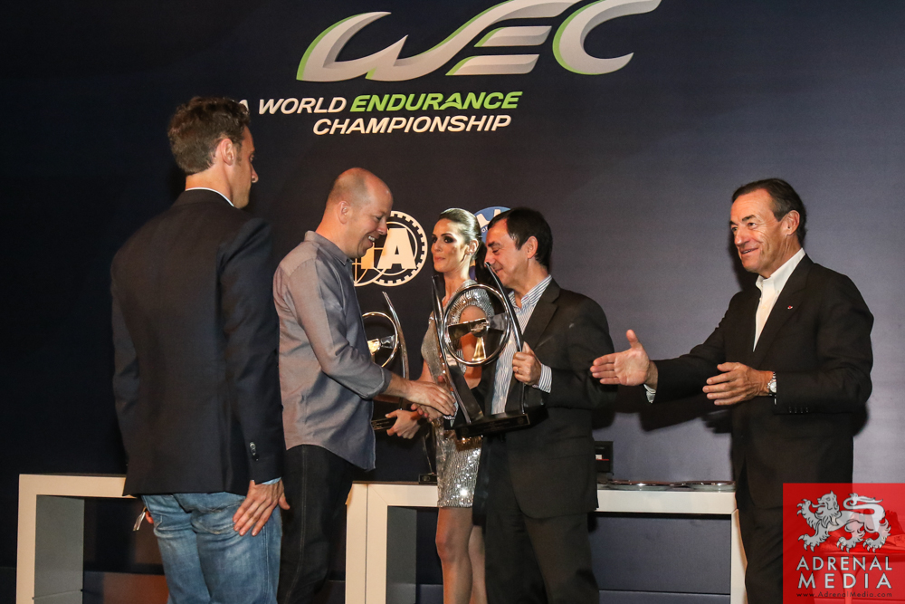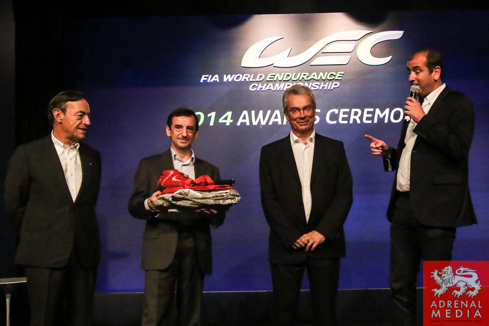 Tom Kristensen receives a present signed by the drivers and official of the FIA WEC